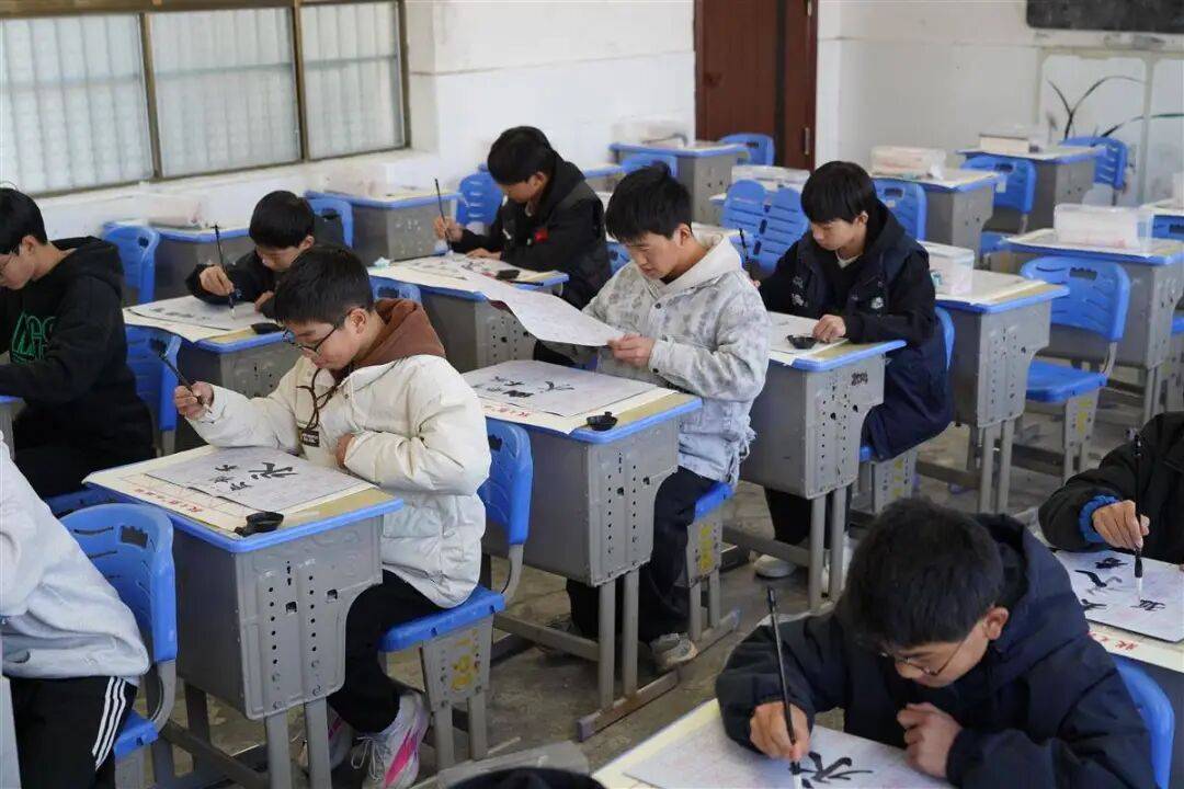 新塘乡双河中学学生在练习书法,书法教具由东风公司捐赠。(湖北日报全媒记者 鲁腾 摄)