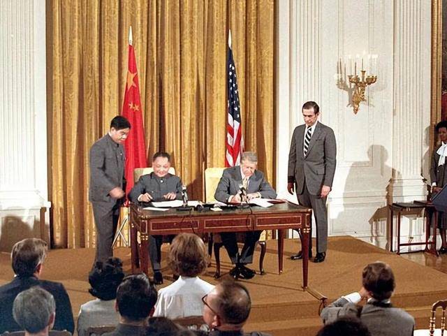 同年访美,受到了美国的高规格接待,两国签订了多项贸易、科技合作协议,揭开了中美合作的新篇章。