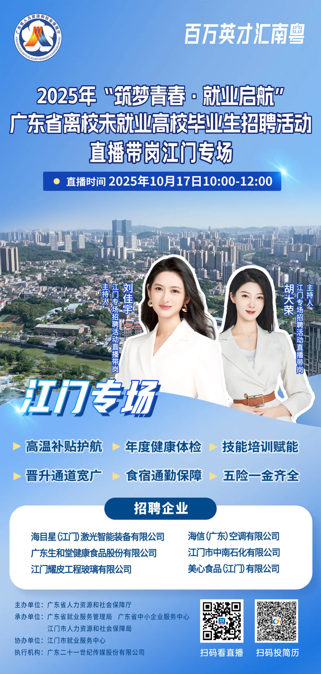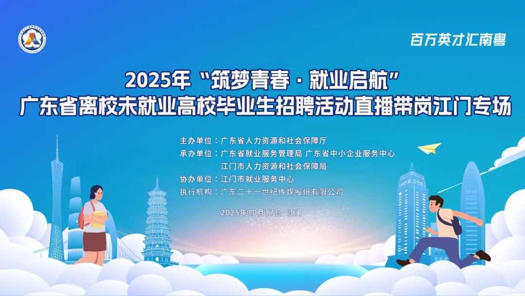 由广东省人力资源和社会保障厅主办,广东省就业服务管理局、广东省中小企业服务中心、江门市人力资源和社会保障局承办,江门市就业服务中心协办,广东二十一世纪传媒股份有限公司支持的2025年“筑梦青春·就业启航——广东省离校未就业高校毕业生招聘活动直播带岗江门专场将于10月17日(周五)10:00--12:00开启。