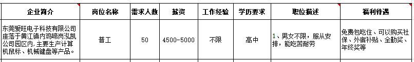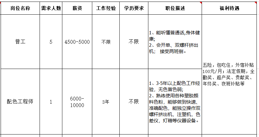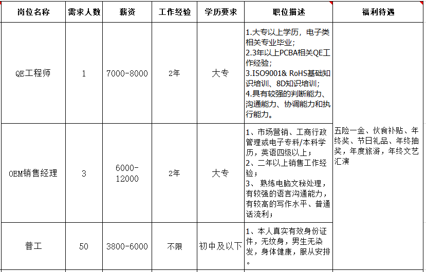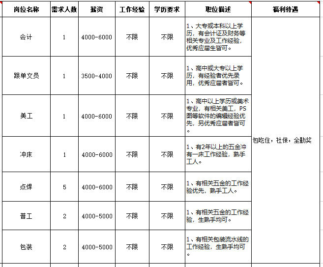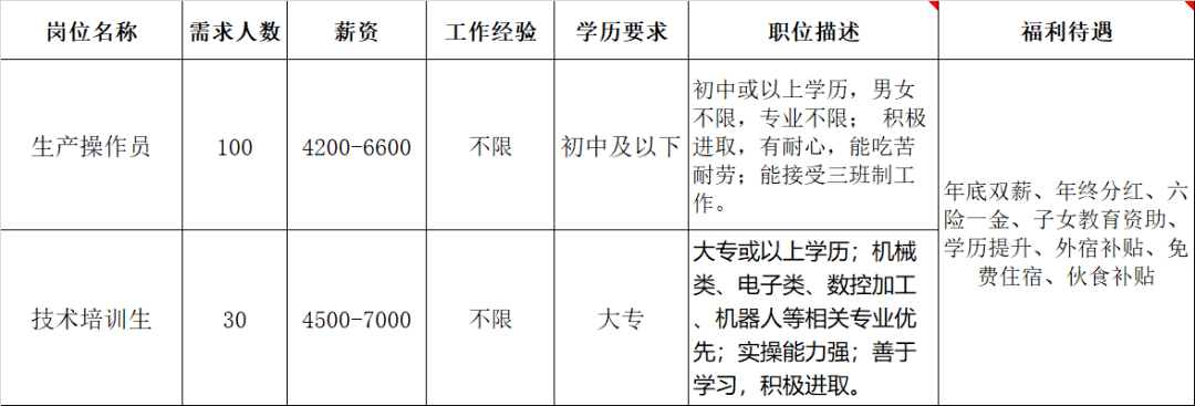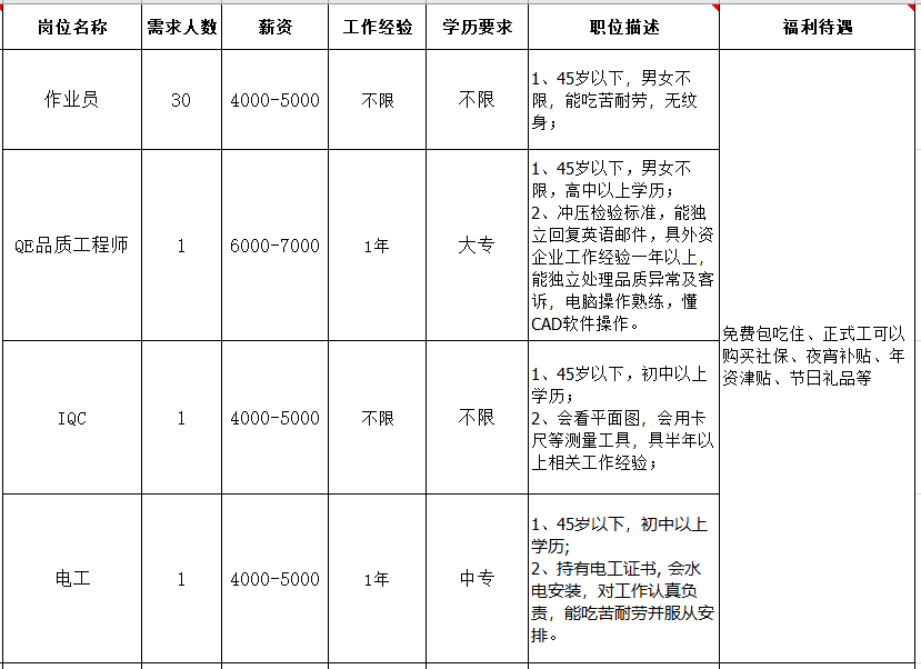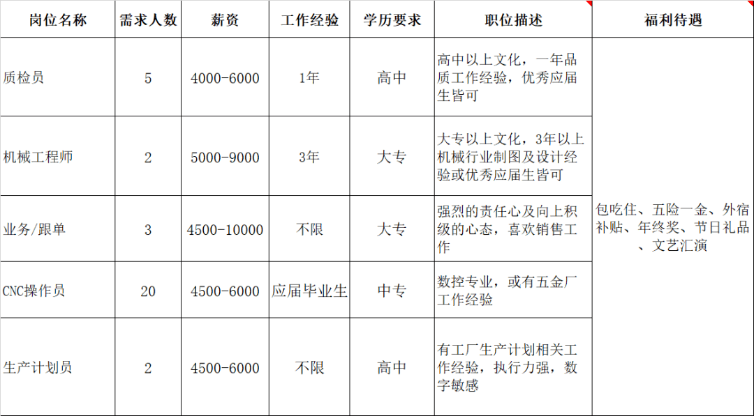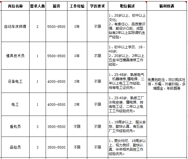 本公司是港资外商独资企业,主要从事弹簧、车床件、冲压件、CNC加工中心等五金零部件的设计、开发、生产制造及销售,获ISO9001、TS16949质量管理体系和ISO14001环境管理体系国际认证。公司管理制度规范、粮期准,康乐设施齐全。现因业务发展扩大,诚聘专才加盟。全包食宿。