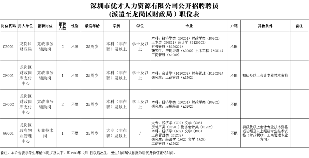 深圳市优才人力资源有限公司公开招聘聘员(派遣至深圳市龙岗区财政局)的公告