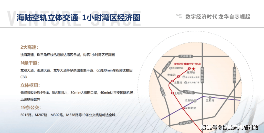 ● 立体路网:项目周边拥有沈海高速、珠三角环线两大高速,以及龙观大道、龙华大道等多条城市主干道。对于驾车出行的企业高管和客户,约30分钟车程即可到达福田CBD,构筑了“1小时湾区经济圈”。